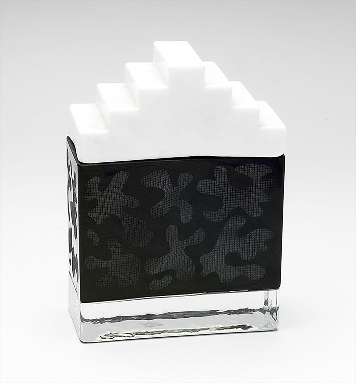 Fixed blown green, yellow, blue, amethyst or black glass, sandblasted decoration, cast lid. Signed "Markku Salo Nuutajärvi Notsjö".