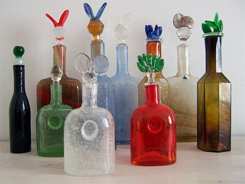 Still-mould blown multi-coloured glass, stoppers cast. Four different designs. All sizes: 180, 220, 270, 300 mm.