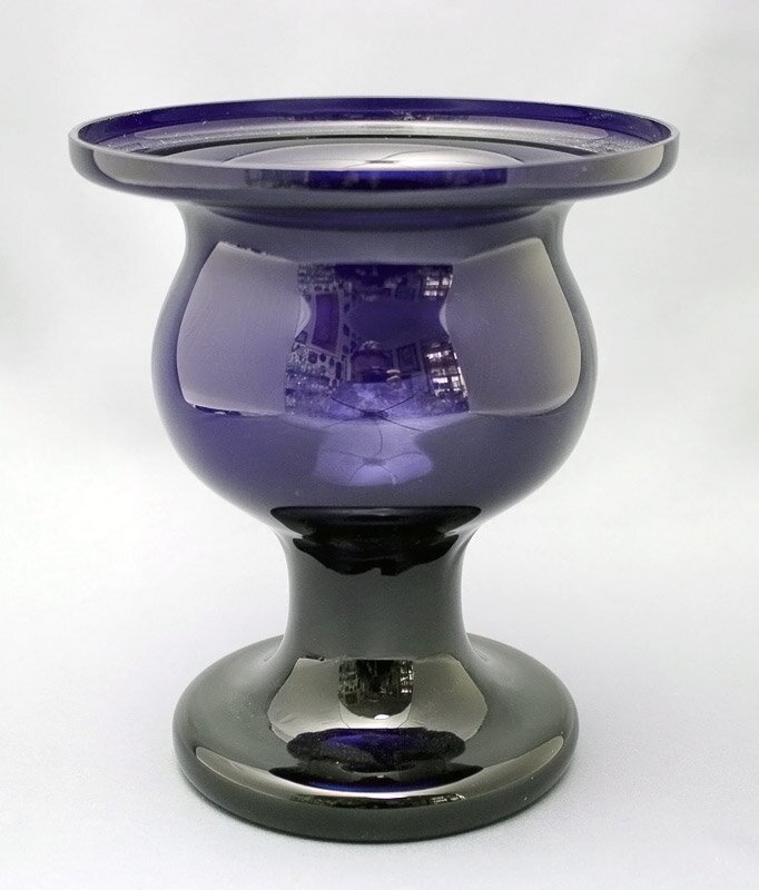 Turned mould blown clear, violet, dark grey or blue glass, cut off.