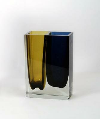 Double vase, handblown cut glass in blue, amber and clear. Engraved "KS Nuutajärvi Notsjö -68". (Martti Kankainen & Unto Suominen).