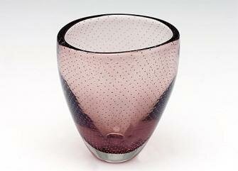 Vapaasti puhallettua väritöntä kirkasta (kellertävä/violetti verho) lasia, piikkimuotti, sivu painettu sisäänpäin, driivattu.