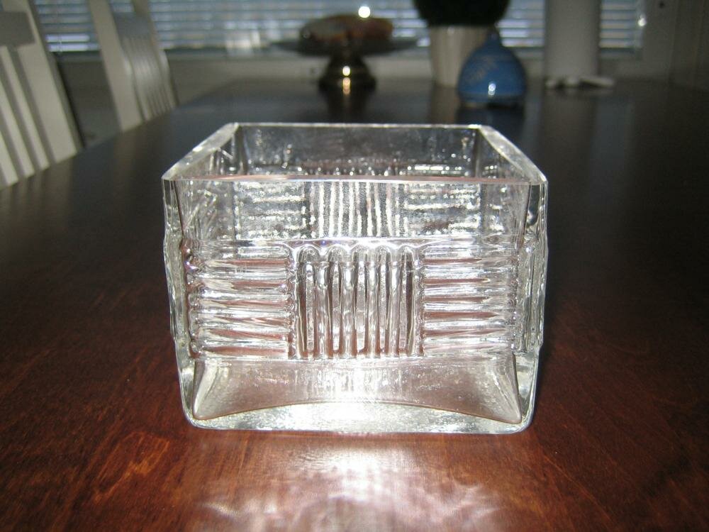 Leveys on 10,8cm ja korkeus 7,8cm ja paino 1425g ainkin vanhan puntarin mukaan. Astiataivasta ym on tullut selailtua aikasemmin tuloksetta. Ja unohdin kertoa että lasissa yläreunassa on ollut selvästi jonkin valmistajan pieni "teippi" kiinni ..josta nyt vain liimat jäljellä.